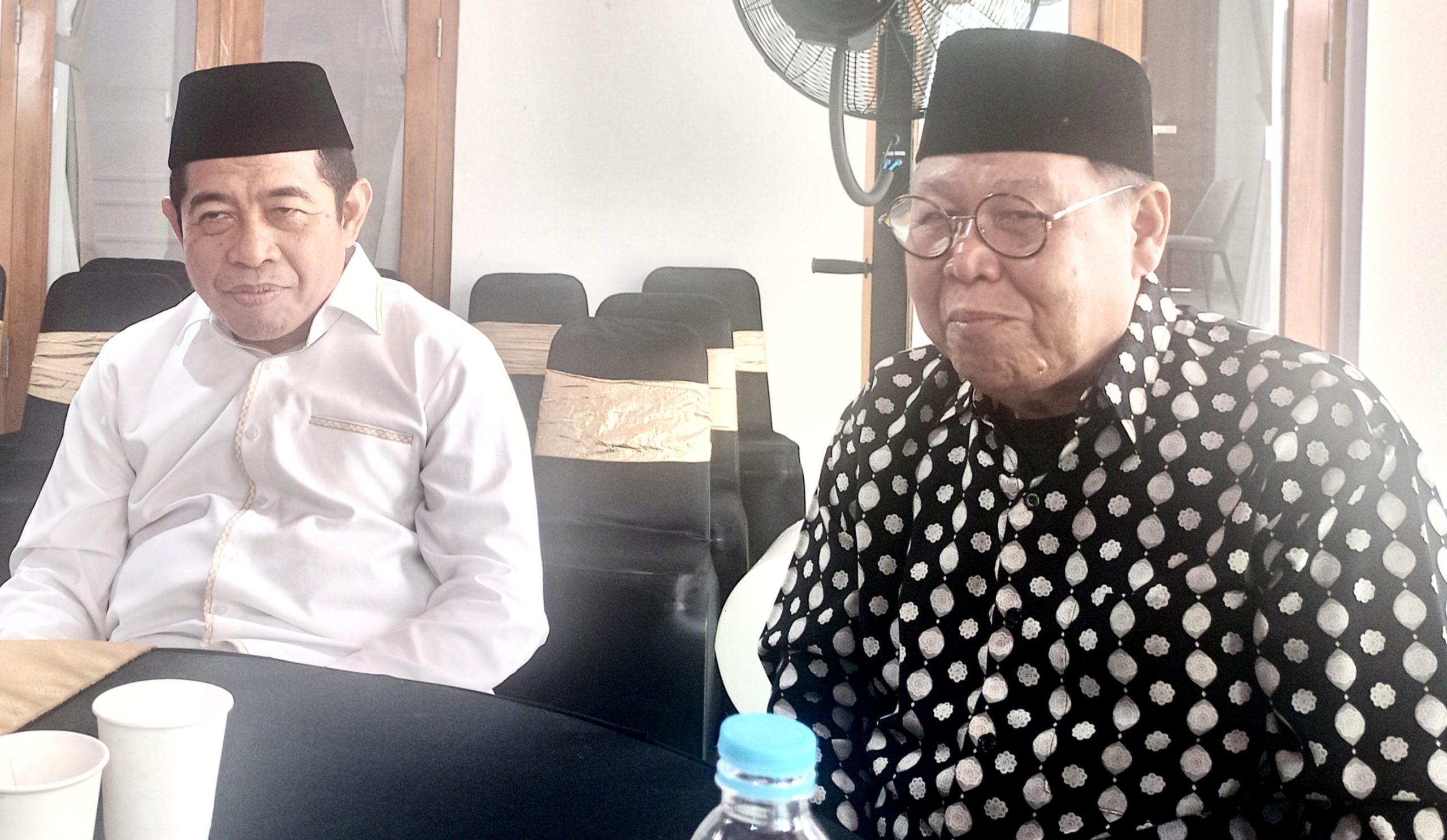Ketua DPRD DKI, KH Khoirudin (kiri) berbincang santai dengan H.Sarnadi Adam saat momen halalbihalal,Minggu (22/3/2026)